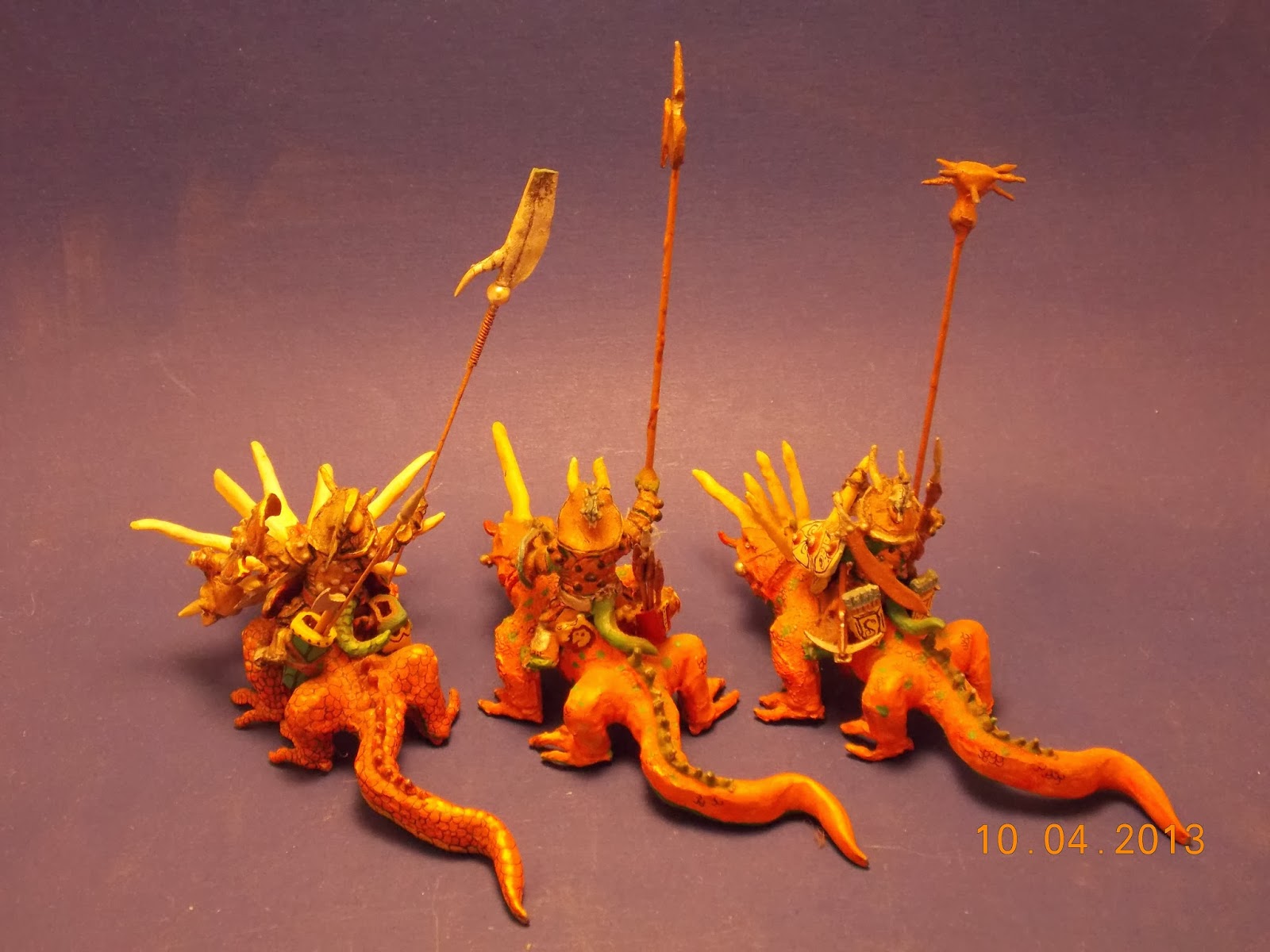 At first glance, they appear to be nicely-painted minis. Upon closer inspection, though, the attention to detail and skill becomes apparent. Each rider carries a unique polearm. Each lizard has a horn or horns sprouting from their heads. Skulls dangle from the horns. The riders hold hand-made reins. Various weapons are slung on the riders and/or their mounts. And there's even some bling in the form of tiny gems here and there. David used drafting pens to accentuate scales to varying degrees on the lizards, as well as on the shields and other bits. You can also see the letter S scribed on a few bits. Is that S for Sutherland, or S for Saurian? I'll go with Sutherland.